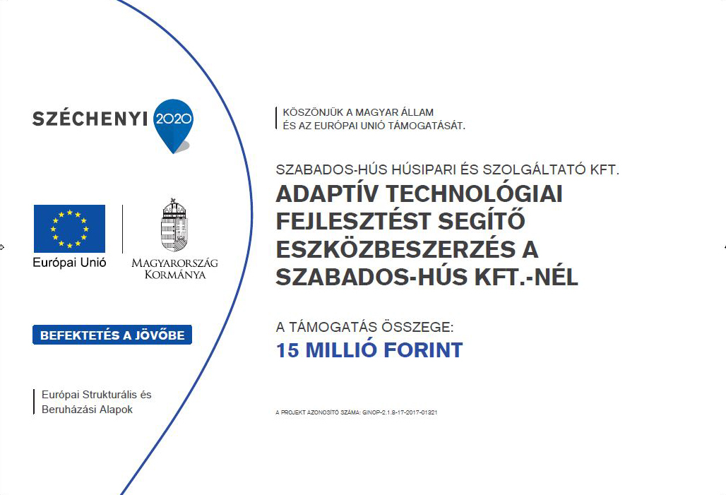 A projekt címe: ADAPTÍV TECHNOLÓGIAI FEJLESZTÉST SEGÍTŐ ESZKÖZBESZERZÉS A SZABADOS-HÚS KFT.-NÉL